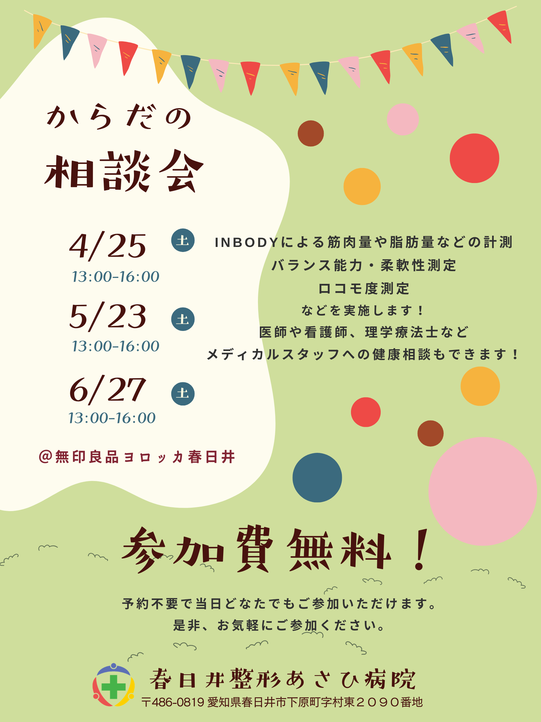 当法人では、皆さまの健康維持や健康増進をサポートするため、定期的に「からだの相談会」を実施しています。今年度も第4土曜日13:00~、無印良品ヨロッカ春日井にて行います。