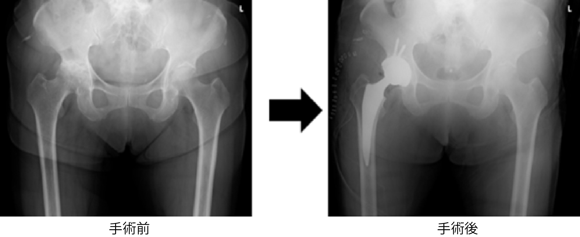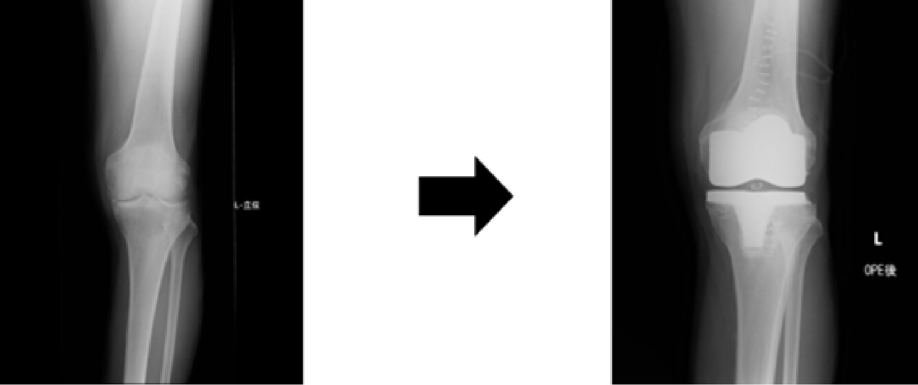 - 変形した関節を、金属やポリエチレンでできた人工関節に入れ替える手術です。