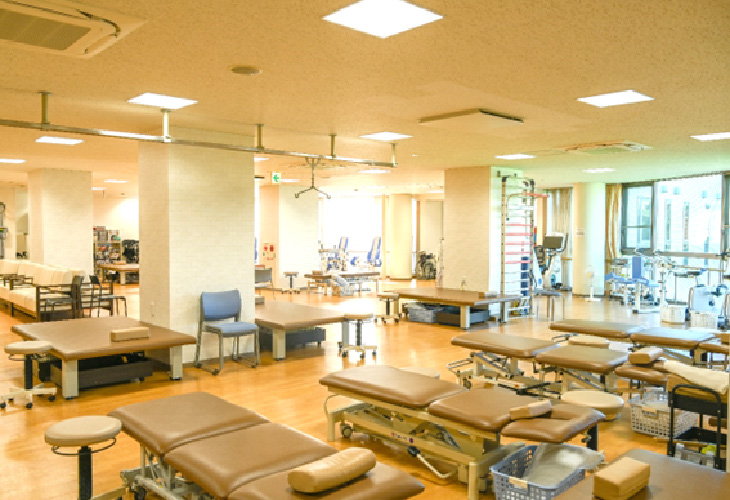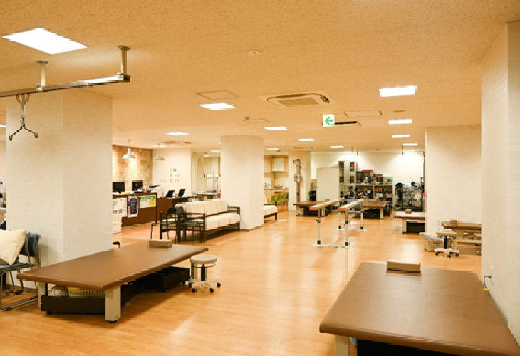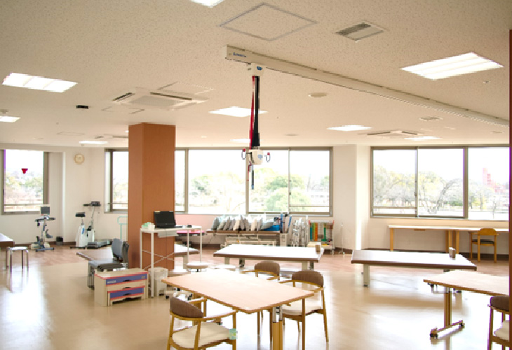 リハビリテーション科は、病院2階の全面ガラス張りの窓から「日本の都市公園100選」として知られる落合公園をのぞむロケーションにあります。